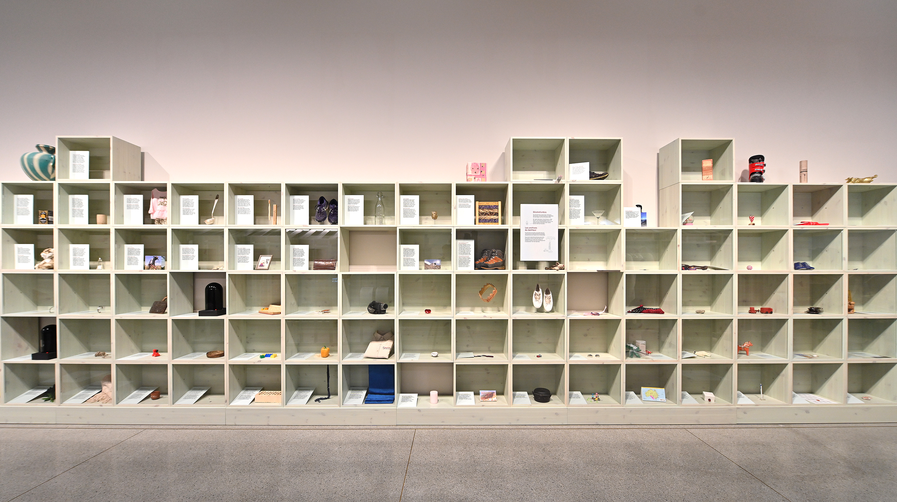 Den regionalen Bezug stellt die Ausstellung auch mit dem Glücksfundus her: Dieser besteht aus Glücksobjekten von Menschen aus Liechtenstein, der Schweiz und anderen Ländern weltweit. Sie symbolisieren für je eine Person das Glück. Kurze Textpassagen ergänzen die so unterschiedlichen Objekte wie etwa eine Zahnbürste oder eine Schnur mit Knoten darin. Der Glücksfundus inspiriert und regt an, eigene Glücksgegenstände für sich ausfindig zu machen.