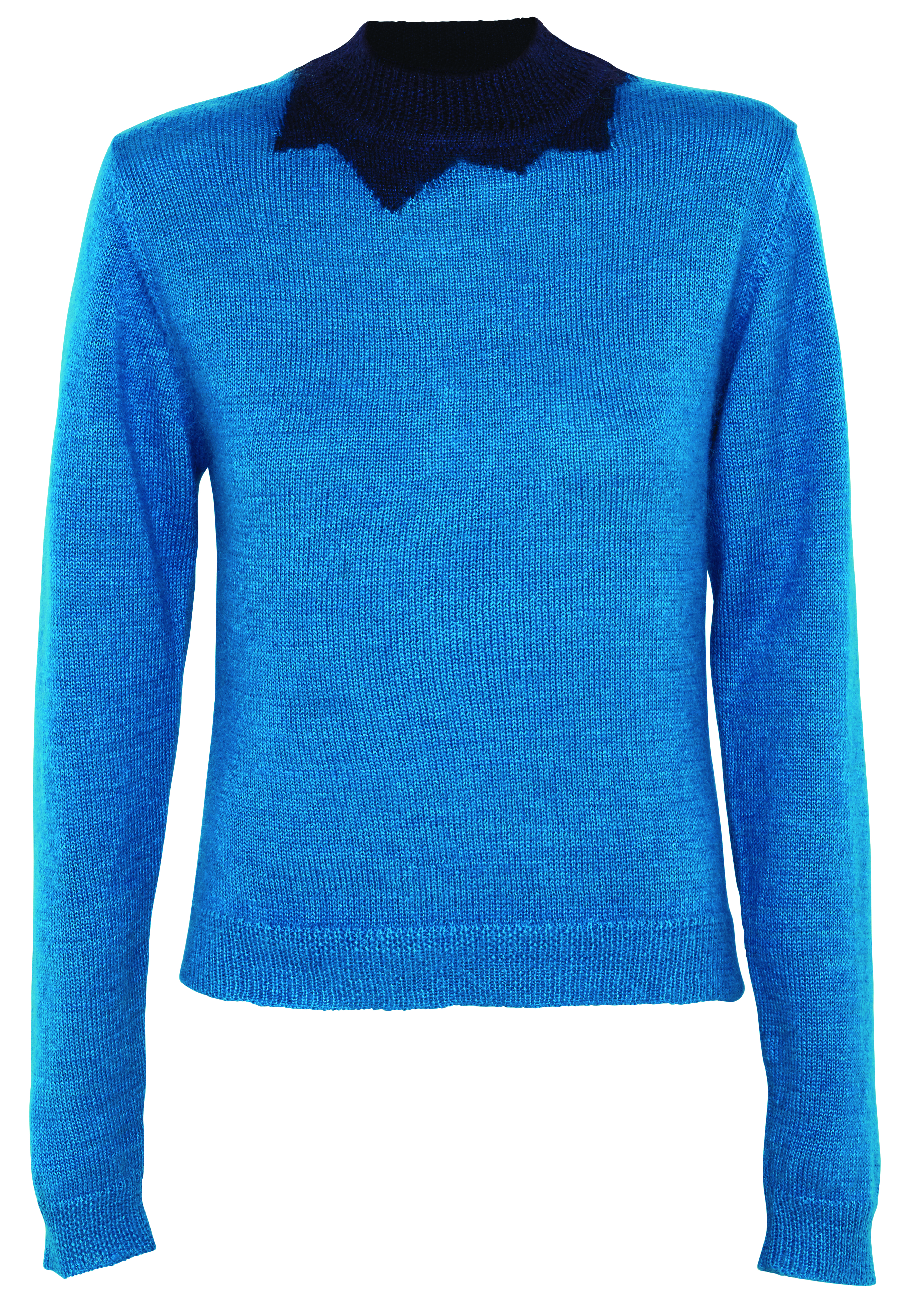 - Damenpullover «Badra»: 44% Mohair, 39% Baumwolle und 17% Seide, azurblau mit schwarzem Zickzackmuster beim Halsausschnitt, S/M + L/XL, Fr. 139.-