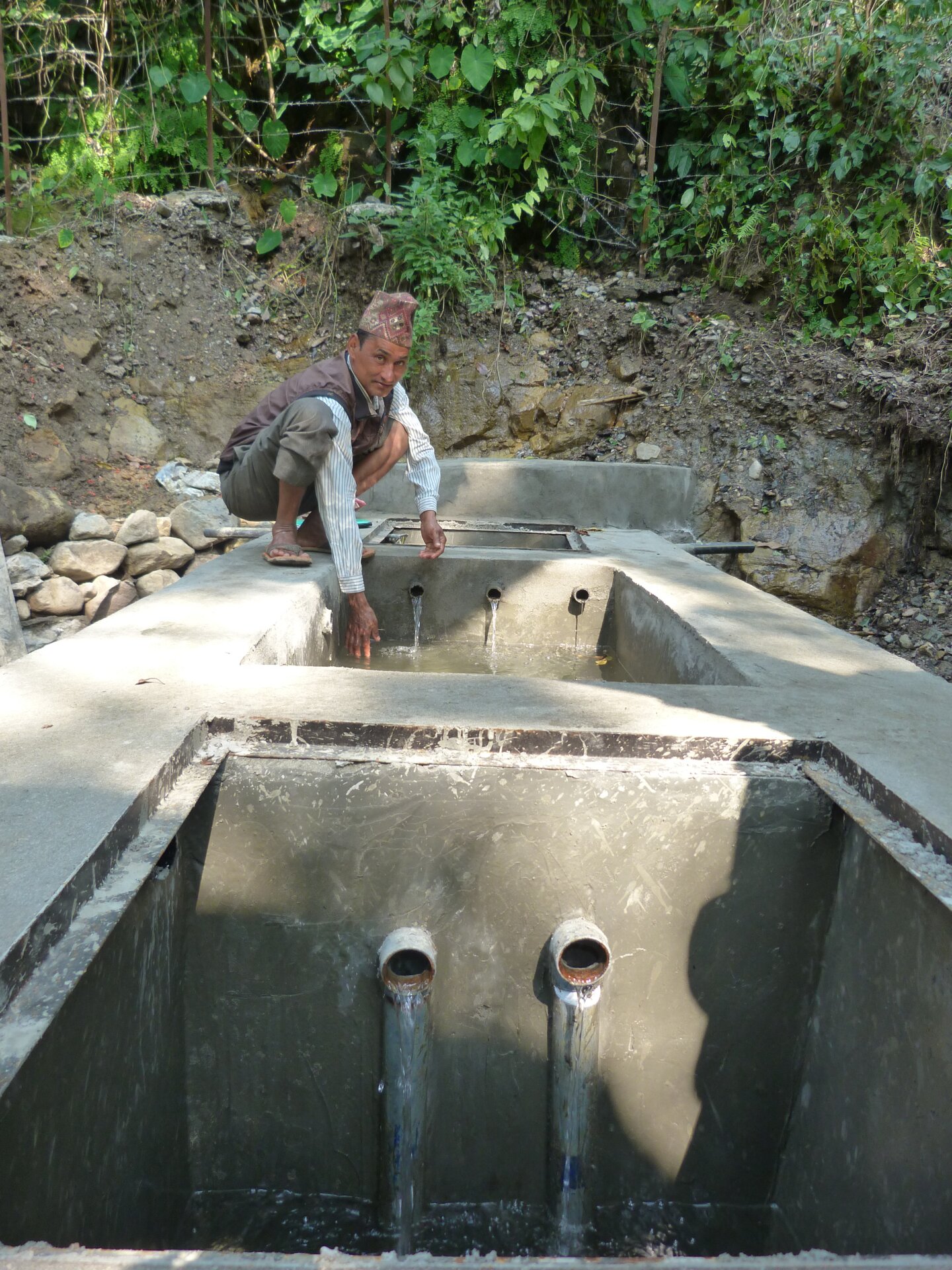 Led by the WUSC chair, Dil Bahadur Tiwari, we follow the pipeline for the water tanks upstream to the source, or rather sources; the scheme is fed by three springs. The 1,800m long trench has already been dug and the pipe laid; all 82 participating households were allocated a section and sent at least one laborer to work on it. The springs are located within a privately-owned area planted with huge banana trees; with thick leaf litter on the ground, it is easy to see why water could have been discolored brown. Before any renovation work started, discussions were held with the landowner, who signed a contract guaranteeing continued access to the source – which is fenced off, albeit with rusting barbed wire that needs to be renewed and repositioned. A graded collection chamber with a sand filter has been constructed, into which the waters from the three springs are channeled. The water emerging from the outlet is clear; the WUSC intends to test it for E.coli on a regular basis both here and at the tanks as well as at some of the eventual private taps stands. Water samples will be sent to a small rural laboratory established in another water supply scheme through Helvetas support.
