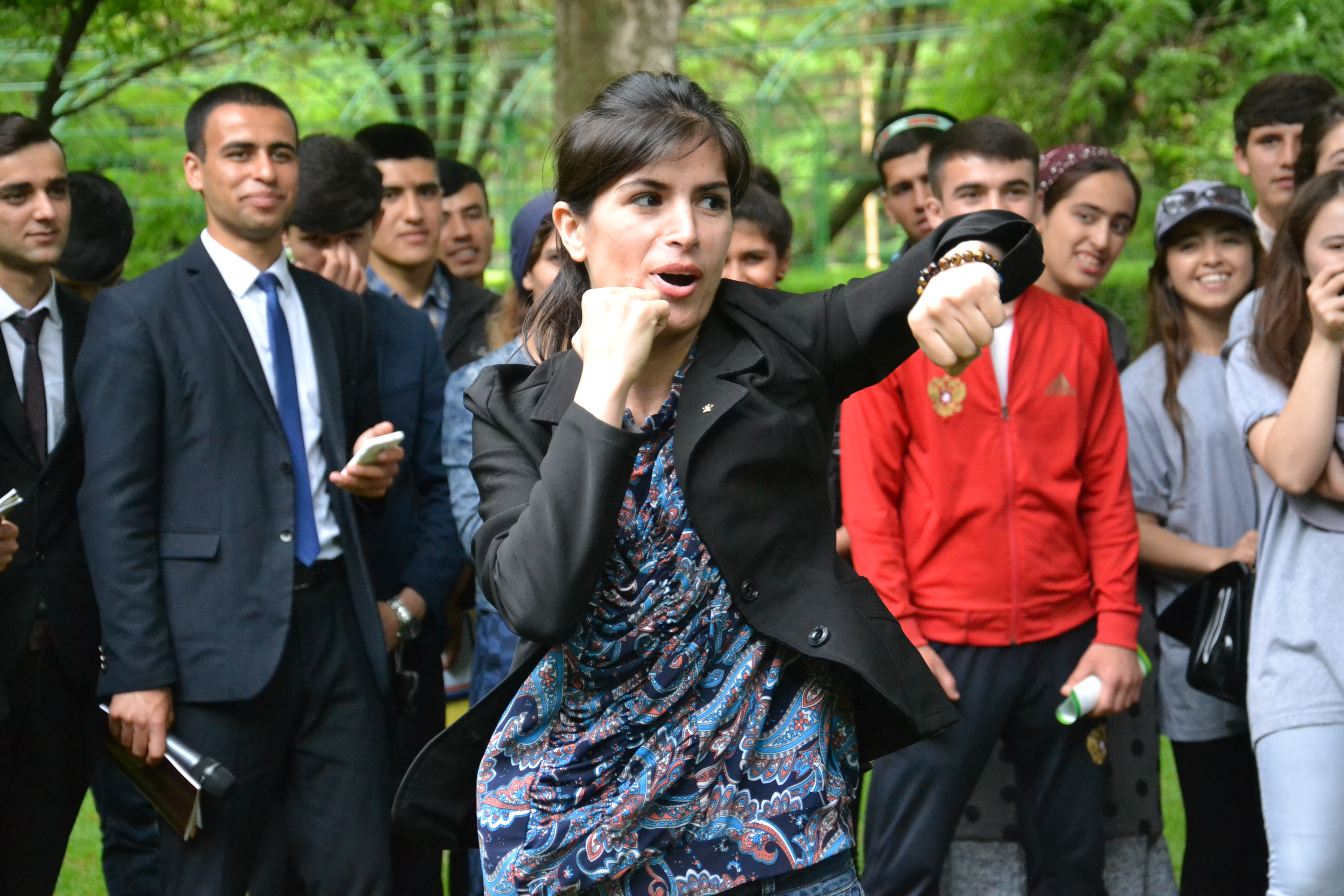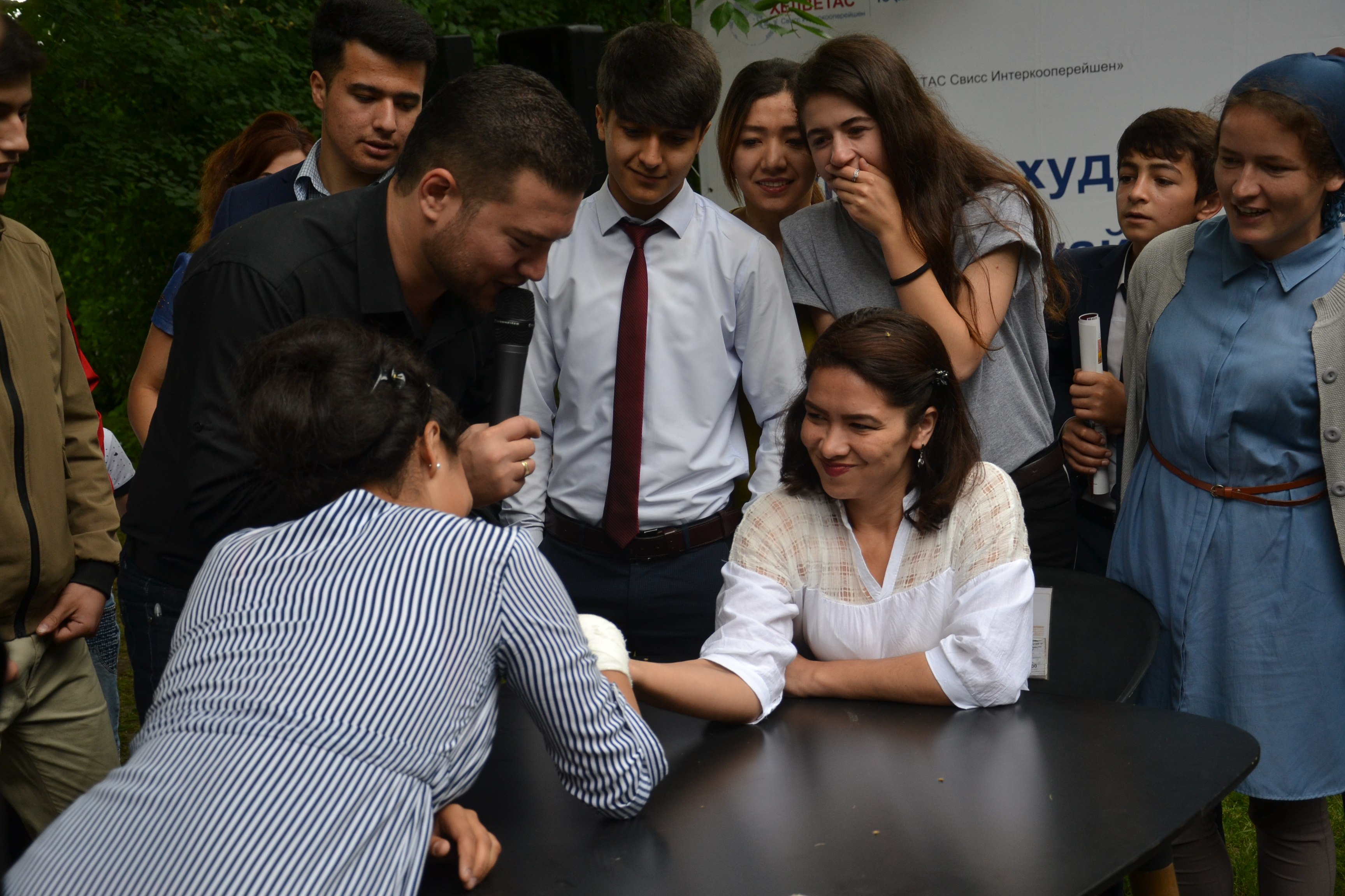 The event started with the warm-up from the karate champion Ms. Matluba Karimova. After the warm-up, participants were invited to the legal quiz, where each correct answer was praised with the gift. The questions were mainly related to the Family Law of Tajikistan. The event was followed by the sports competitions among young mothers and arm-restling challenge among both girls and boys.