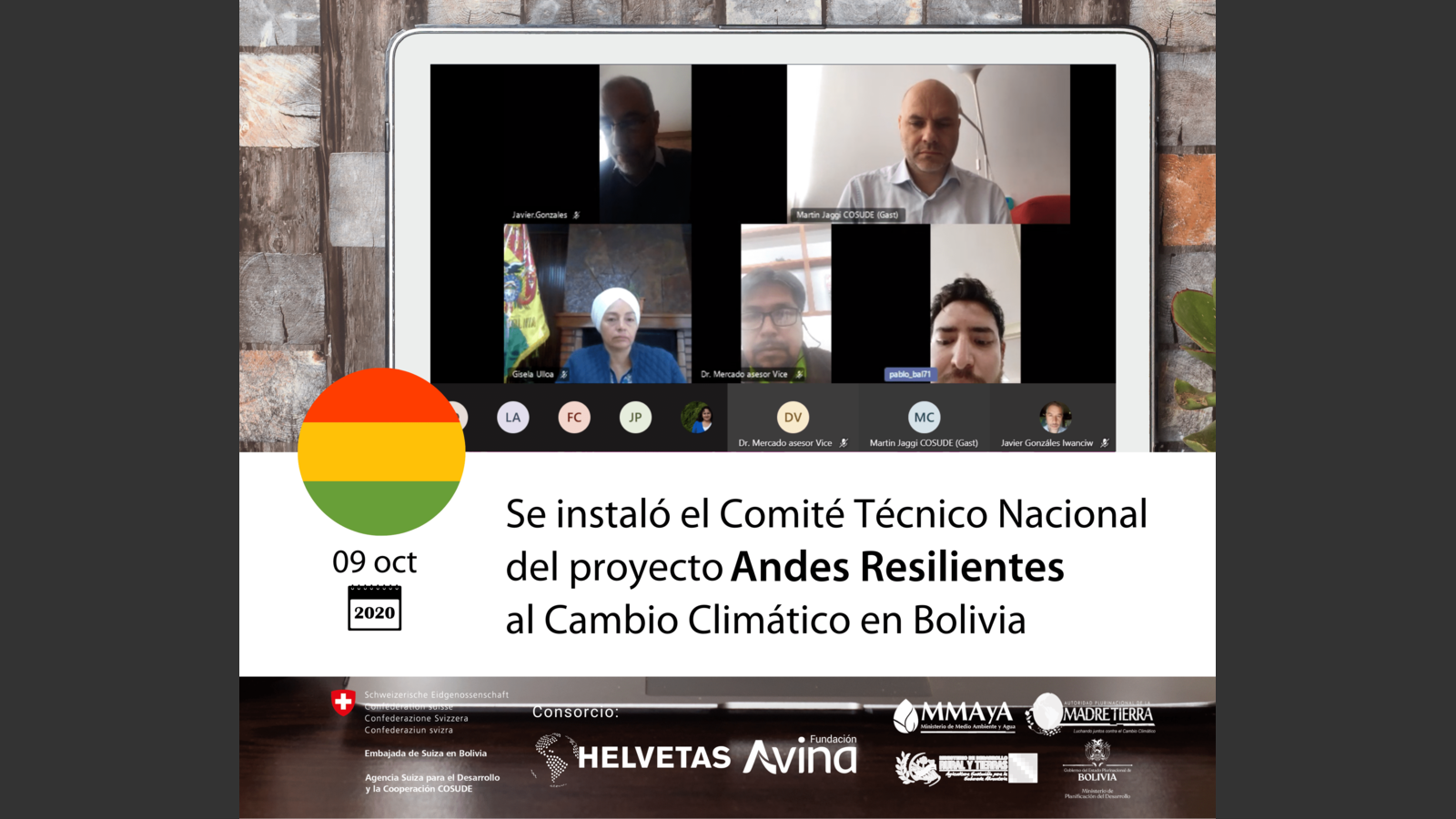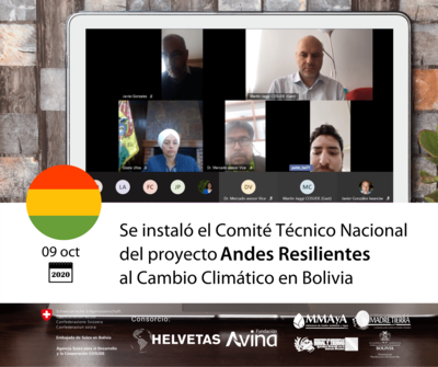 La Paz, Bolivia – 09 de octubre de 2020. El 09 de octubre se realizó la sesión de instalación del Comité Técnico Nacional del proyecto regional Andes Resilientes al Cambio Climático en Bolivia, impulsado por el Programa Global de Cambio Climático y Medio Ambiente de la Cooperación Suiza COSUDE y facilitado por el consorcio HELVETAS Swiss Intercooperation – Fundación Avina.