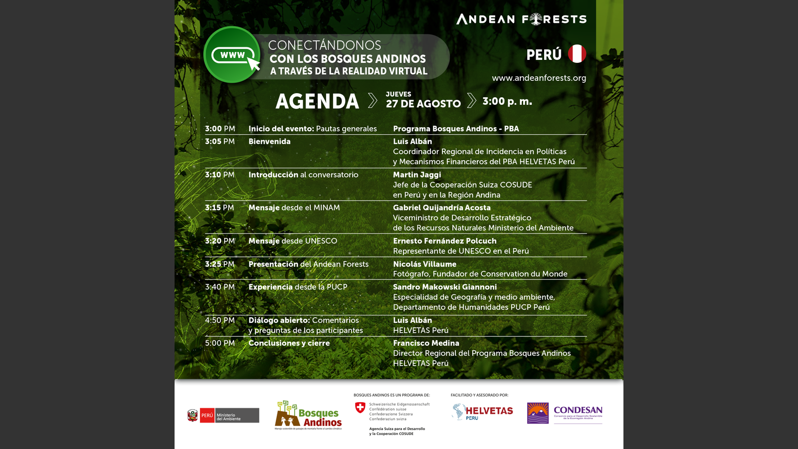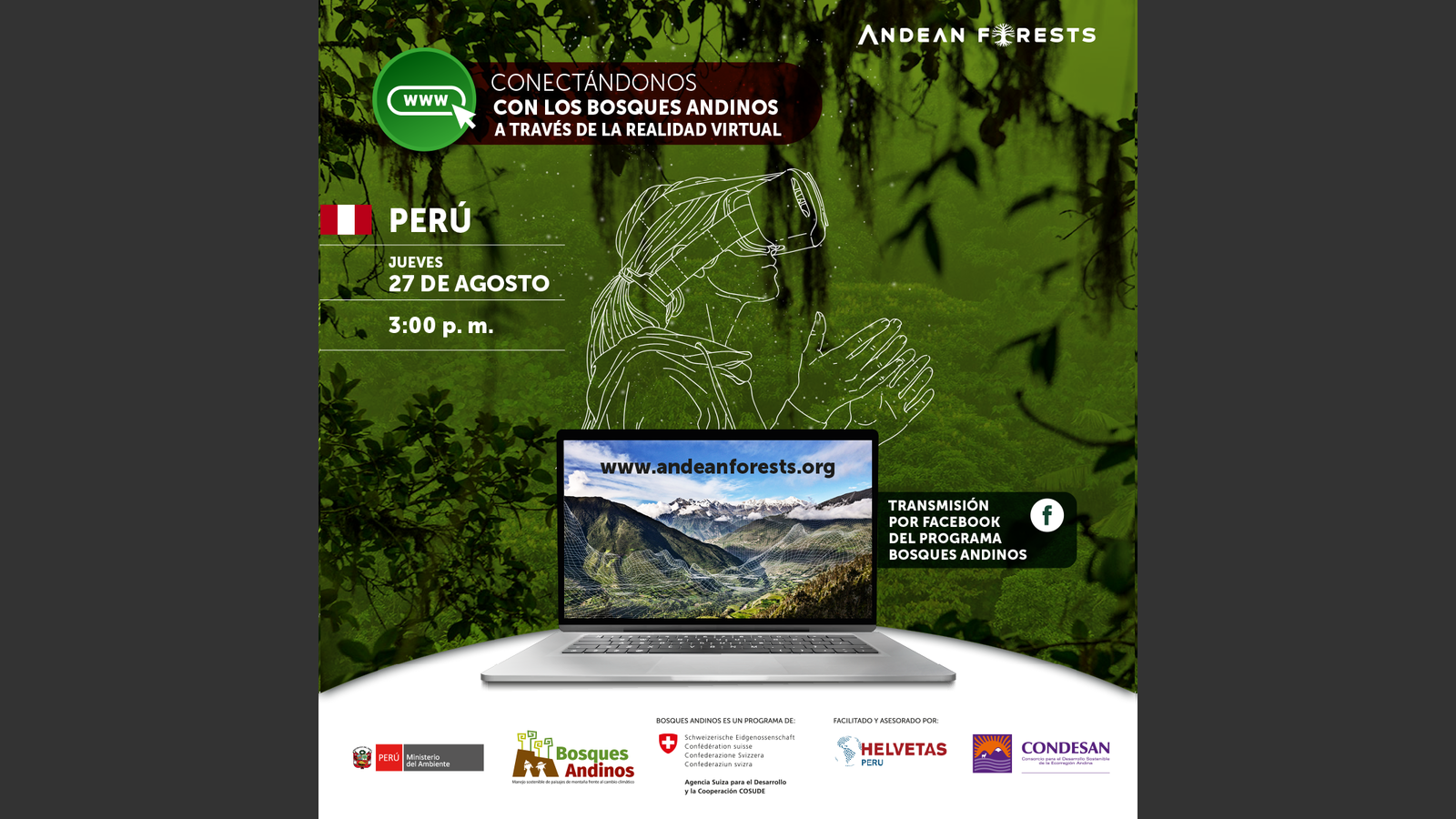 El Programa Bosques Andinos, una iniciativa implementada en los países andinos que busca, a través de estas conversaciones, conectar más a estos bosques con las personas y a las instituciones que toman decisiones sobre su protección, restauración y uso sostenible, y contribuir con ello a generar compromisos futuros para su permanencia en el tiempo y como legado del capital natural de nuestros países al mundo. Es una iniciativa implementada en los países andinos, forma parte del Programa Global de Cambio Climático y Medio Ambiente de la Cooperación Suiza COSUDE, y es facilitado por el consorcio HELVETAS Perú – Condesan.