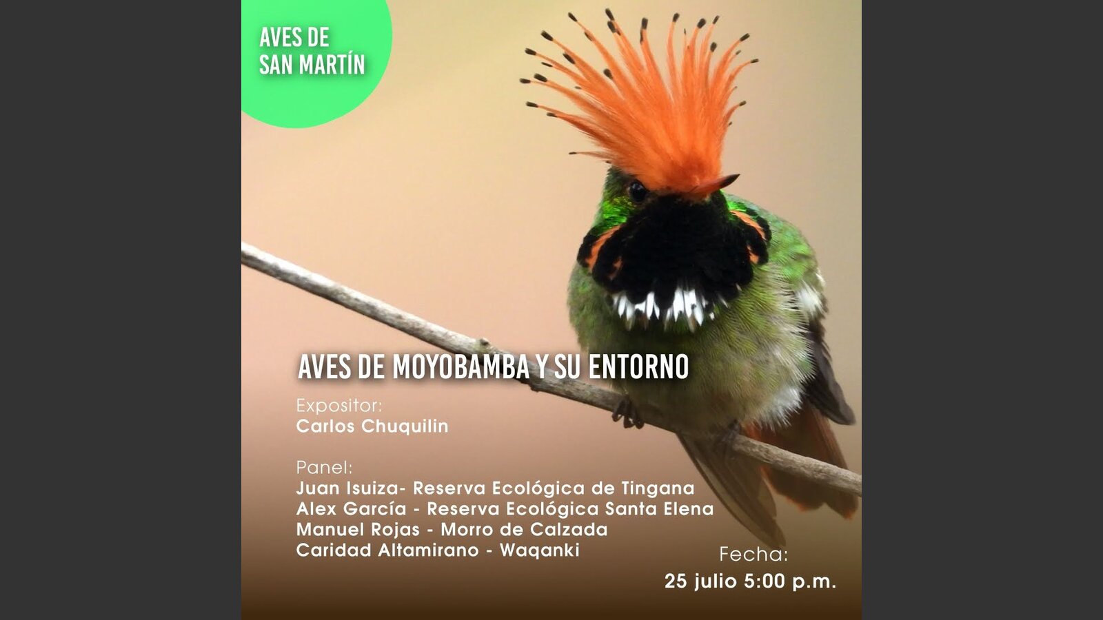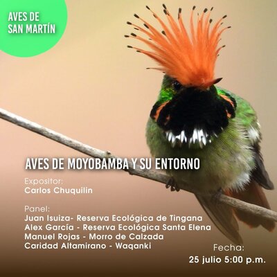 - 25 de julio: Presentación: Aves de Moyobamba y su entorno / Panel: Sitioos de observación de aves de Moyobamba (Waqanki - Morro de Calzada - Santa Elena - Tingana). Horario de 5 a 7 pm.