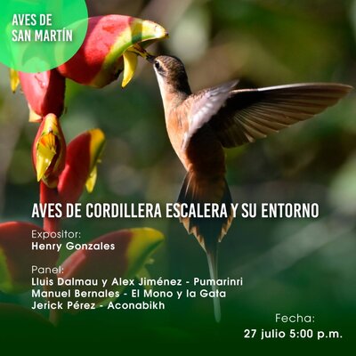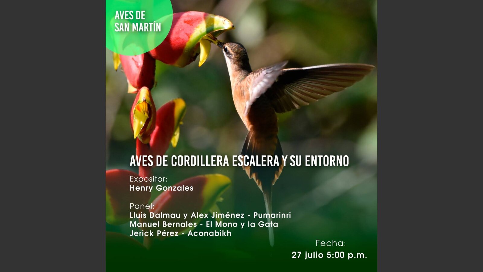 - 27 de julio: Presentación: Aves de Cordillera Escalera y su entorno / Panel: Sitios de observación de aves de Cordillera Escalera y entorno (Aconabikh - El Mono y la Gata - Pumarinri - Ricuricocha). Horario de 5 a 7 pm.