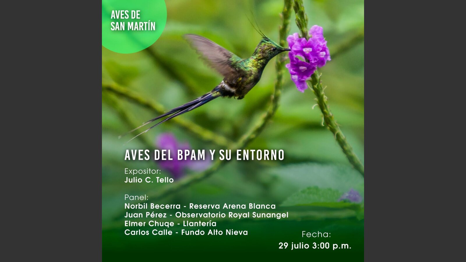 - 29 de julio: Presentación: Aves del BPAM y su entorno / Panel: Sitios de observación de aves de BPAM y sus alrededores (Reserva Arena Blanca - Llantería - Sendero Royal - Fundo Alto Nieva). Horario de 3 a 5 pm.