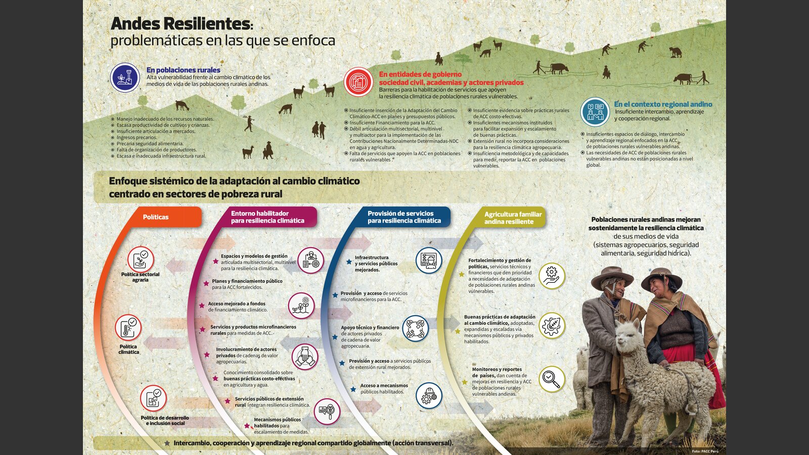El proyecto regional Andes Resilientes al Cambio Climático busca contribuir en el fortalecimiento y articulación de las capacidades de actores públicos y privados para proveer servicios orientados a mejorar la resiliencia y la capacidad de adaptación al cambio climático, de poblaciones rurales andinas en pobreza y vulnerabilidad hacia la mejora de su seguridad alimentaria y seguridad hídrica.