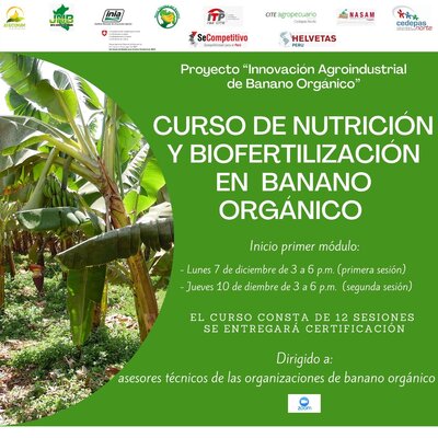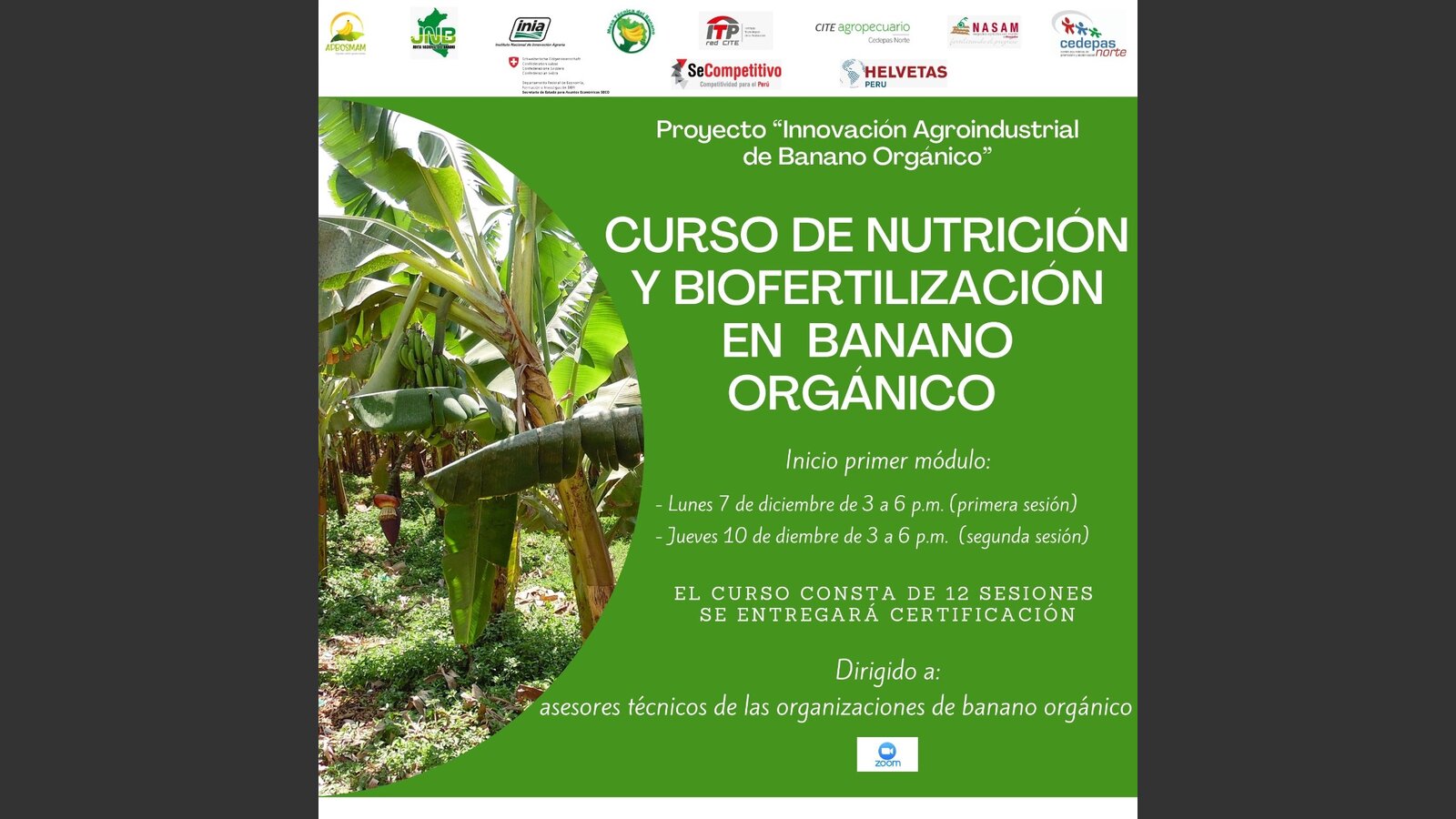 La Cooperativa Agraria APBOSMAM y Cedepas Norte, en el marco del proyecto "Innovación Agroindustrial de Banano Orgánico" del Programa SeCompetitivo de la Cooperación Suiza Seco,gestionado por Helvetas Perú, dio inicio al curso NUTRICIÓN Y BIOFERTILIZACIÓN EN PLANTACIONES DE BANANO ORGÁNICO, el cual se desarrolla de manera virtual del lunes 7 de diciembre, con la participación de representantes de las organizaciones de pequeños productores y actores de la cadena de banano orgánico.