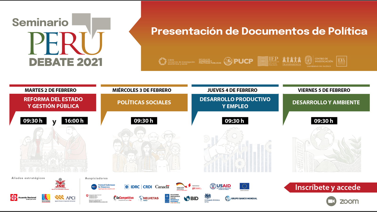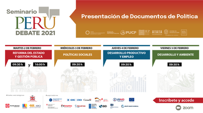 Veinte documentos de política con diagnóstico, propuestas de política y hoja de ruta a cien días, un año y cinco años de gestión serán expuestos del 02 al 05 de febrero en el Seminario Perú Debate 2021. .