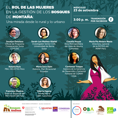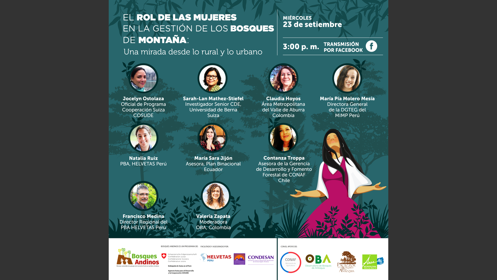 Con el objetivo de socializar los hallazgos del Programa Bosques Andinos (PBA) en Antioquia, Pichincha y Apurímac; así como, promover la reflexión en torno a los aspectos de género en la gestión y conservación de bosques andinos, el pasado miércoles 23 de setiembre se llevó a cabo el webinar “El rol de las mujeres en la gestión de los bosques de montaña: una mirada desde lo rural y lo urbano”.