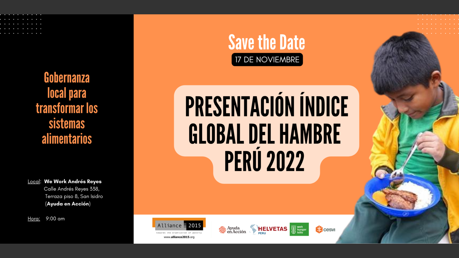 El 13 de Octubre del 2022 se presentó el informe del Índice Global de Hambre 2022 a nivel mundial, una iniciativa de dos miembros de Alliance 2015 (Welthungerhilfe y Concern Worldwide). El informe global tiene como título “Food Systems Transformation and Local Governance”, abordando en esta edición, la importancia de la gobernanza de los sistemas alimentarios, un determinante clave en la capacidad de las personas para acceder a dietas nutritivas y sostenibles; y el potencial de la gobernanza local para contribuir a la transformación de los sistemas alimentarios.
