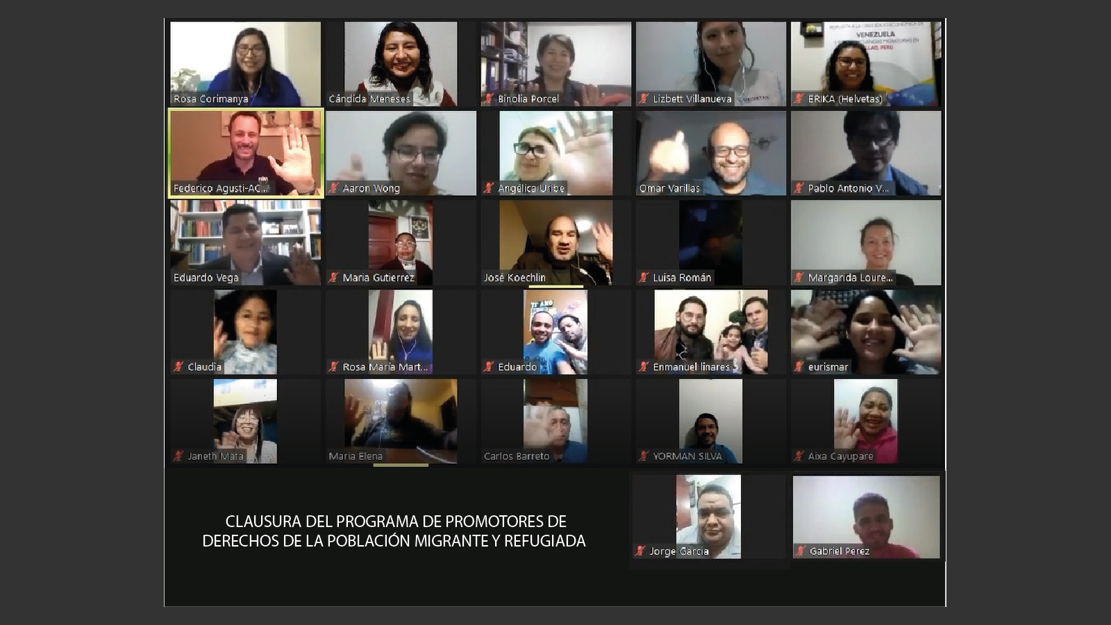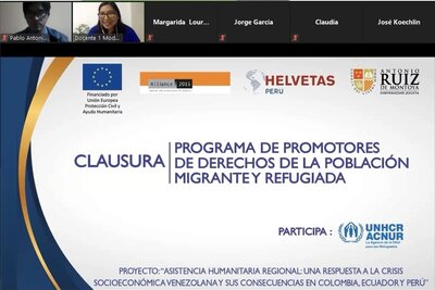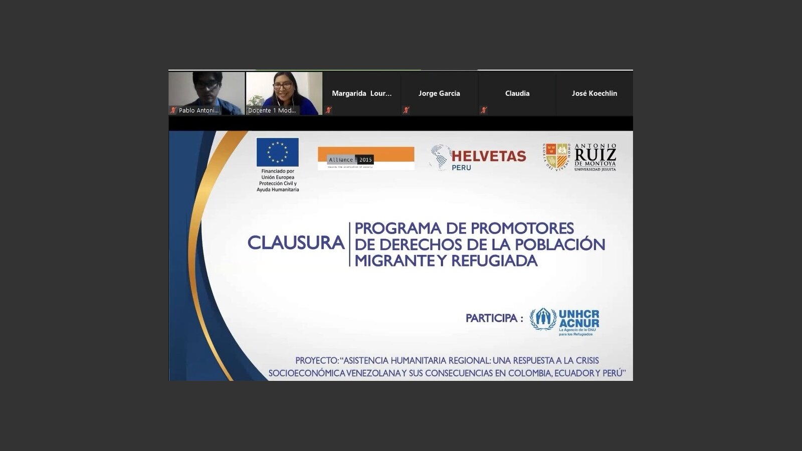 En un acto desarrollado de manera virtual, el pasado domingo 31 de mayo, se realizó la clausura al Programa realizado mediante un convenio entre Helvetas Perú y la Universidad Antonio Ruiz de Montoya. La capacitación se desarrolló del 17 de abril al 25 de mayo, con la participación de 25 ciudadanos(as) venezolanos(as), en el marco del proyecto “Asistencia humanitaria regional: una respuesta a la crisis socioeconómica venezolana y sus consecuencias en Colombia, Ecuador y Perú”, ejecutado en Perú por HELVETAS Perú, como parte de la Alliance2015, con el financiamiento de la Unión Europea Ayuda Humanitaria y Protección Civil.