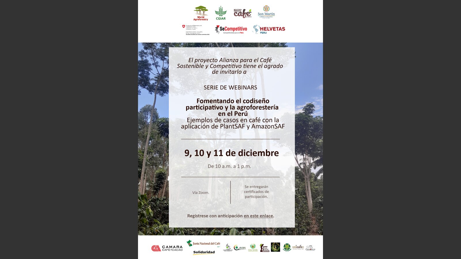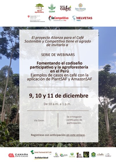 En el marco de este proyecto se están organizando una serue de webinars denominadas "Fomentando el codiseño participativo y la agroforestería en el Perú", que recogen casos en café con la aplicación de PlantSAF y AmazonSAF.
