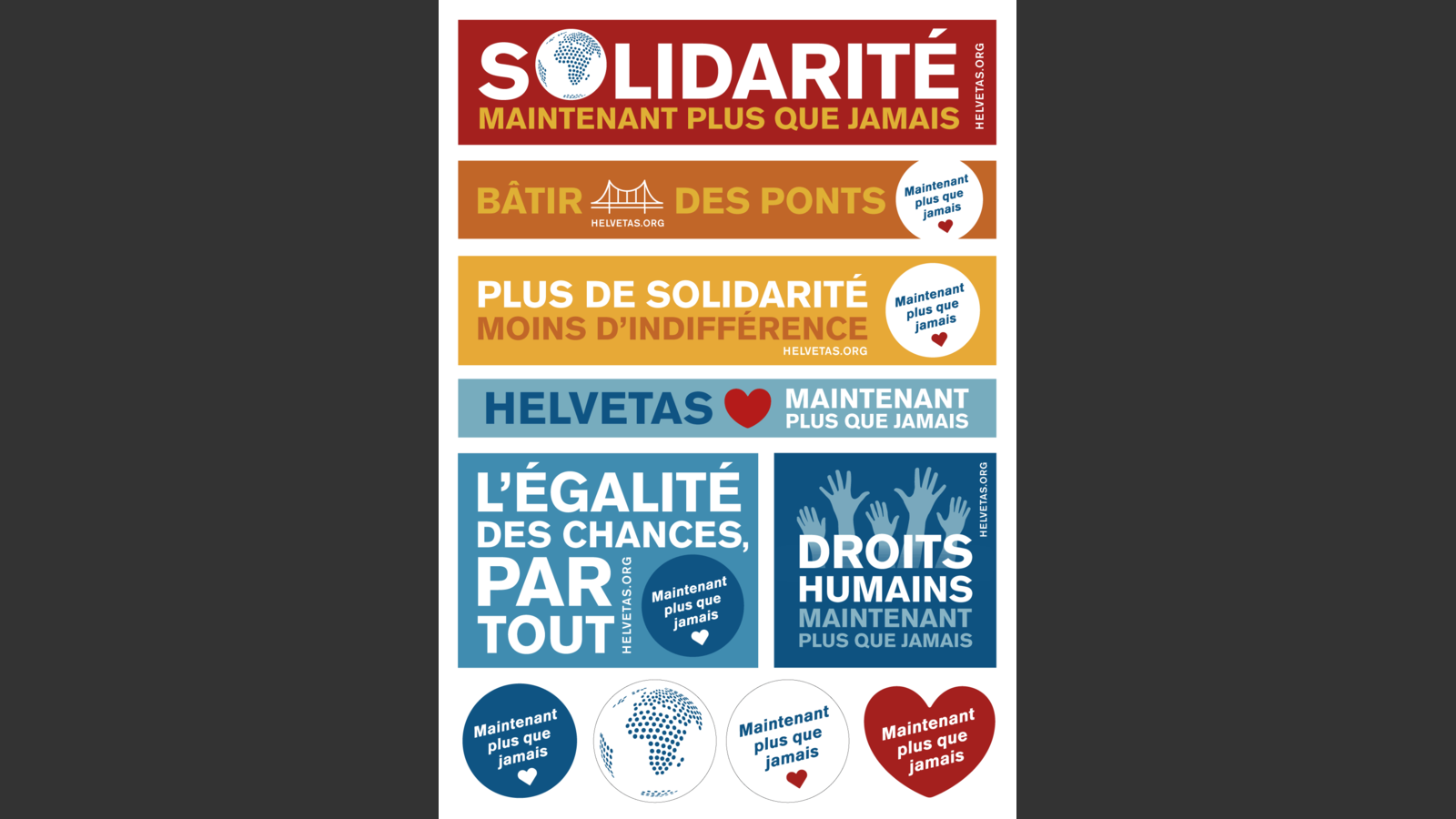 Commandez aujourd'hui votre feuille d'autocollants et affichez votre solidarité avec un monde dans lequel personne n'est oublié. Que vous le placiez sur votre ordinateur portable, votre boîte aux lettres ou votre vélo: chaque autocollant compte. Plus nous serons nombreux·euses à participer, plus notre message gagnera en force.