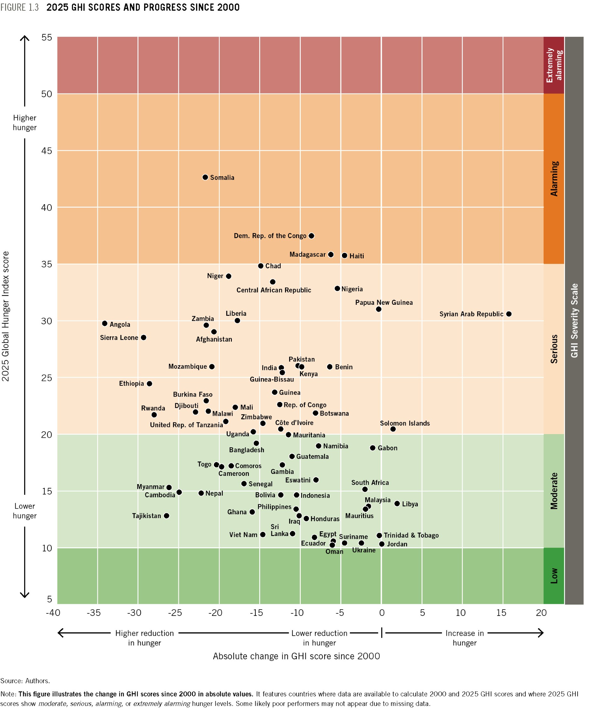 Toutefois, le rapport de l'Indice de la faim dans le monde 2025 fait également état de progrès dans certains pays, tels que le Népal, le Bangladesh, la Somalie, l’Ouganda, le Rwanda, le Togo ou le Mozambique.